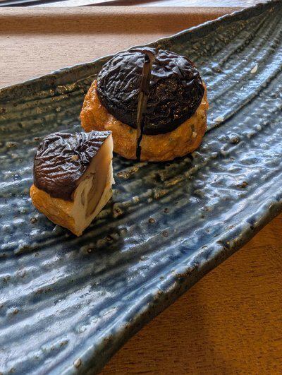 海老とお魚のすり身に、ごぼう・人参・長葱を加え椎茸をかぶせ揚げているんです。
